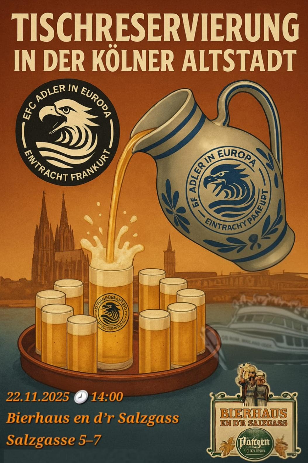Treffpunkt Bierhaus Salzgasse. Doch Tim hat andere Prioritäten: Döner. Natürlich. Björn und Karo erscheinen pünktlich, beobachten unser Dönerdrama. Erste Prognosen und Befürchtungen zum Spiel werden ausgetauscht. Danach stolpern wir die letzten 200 Meter zum EFC-Treff. Es ist ein nettes Beisammensein, Björn und Karo sind dann auch satt, der Kölsch-Klingelbeutel wandert durch die Runde, am Ende waren es 132 Kölsch plus die Apfelschorle von Karo, kleine Nachträge werden passend ausgeglichen – feinste Finanzakrobatik im Bierhaus.