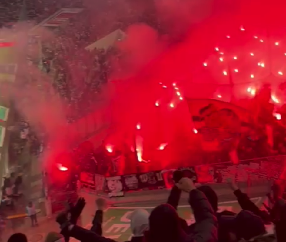 Proteste gegen Verschärfung der Fan Überwachung sind angekündigt. Stadionsprecher: „Wir erwarten heute den Einsatz von Pyrotechnik. Pyrotechnik ist aber verboten.“ Na klar. Das Spiel beginnt – natürlich mit dem ersten Tor für Köln. Die ersten zwölf Minuten herrscht Stille. Dann: Kölner Kurve explodiert in rotem Licht. Zweite Halbzeit, Eintracht-Fans ziehen nach – Raketen inklusive. Letzteres sollte nicht sein – Nichts darf die Hand verlassen.