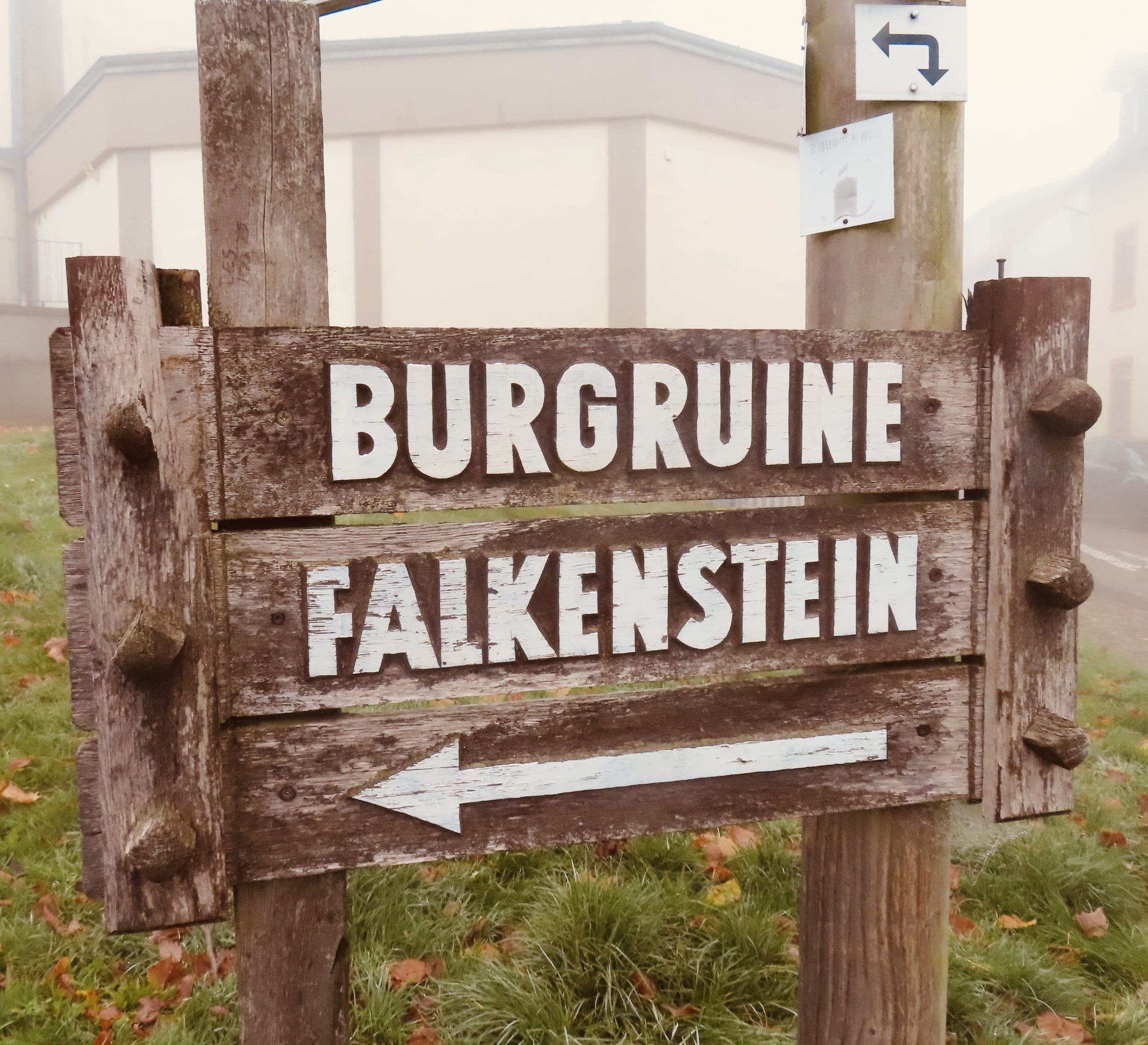 Wir wären beinahe falsch abgebogen, was im Nebel keine Leistung, sondern Pflicht ist. Zwei Stunden zu früh standen wir plötzlich kurz vor dem Ziel, was uns stutzig machte. Niemand erreicht bei einer Herbstwanderung im Taunus sein Ziel zu früh. Also gingen wir doch noch links herum, einmal rund um Falkenstein, aus Prinzip.