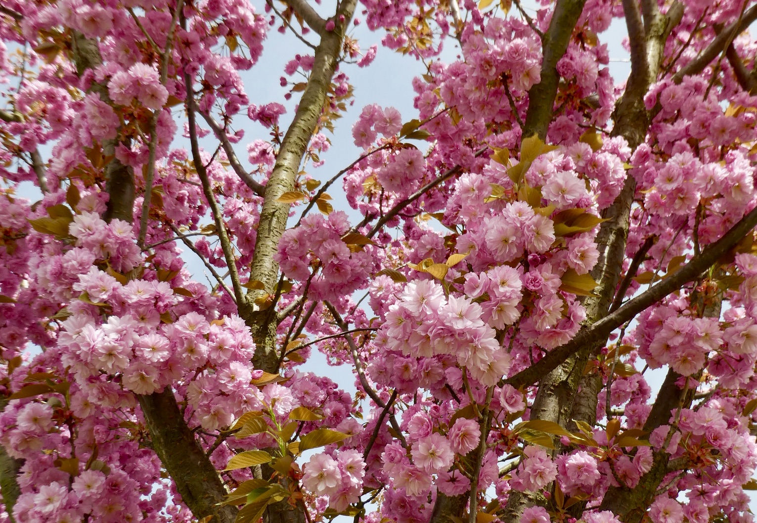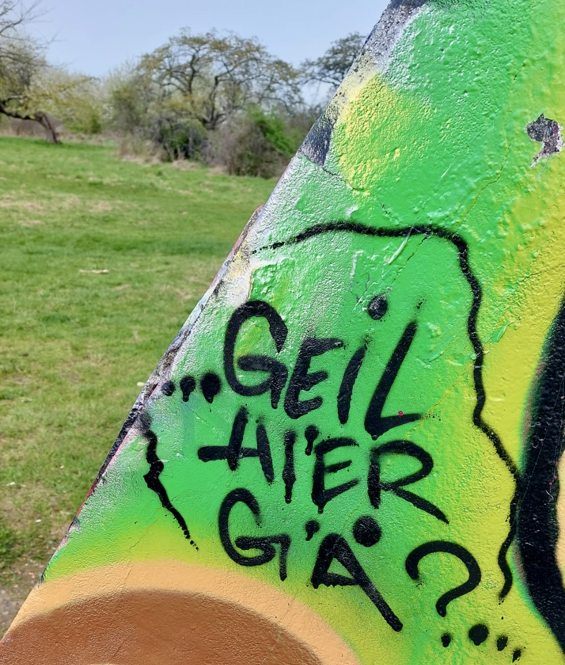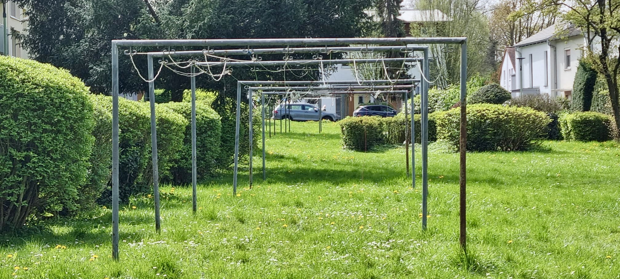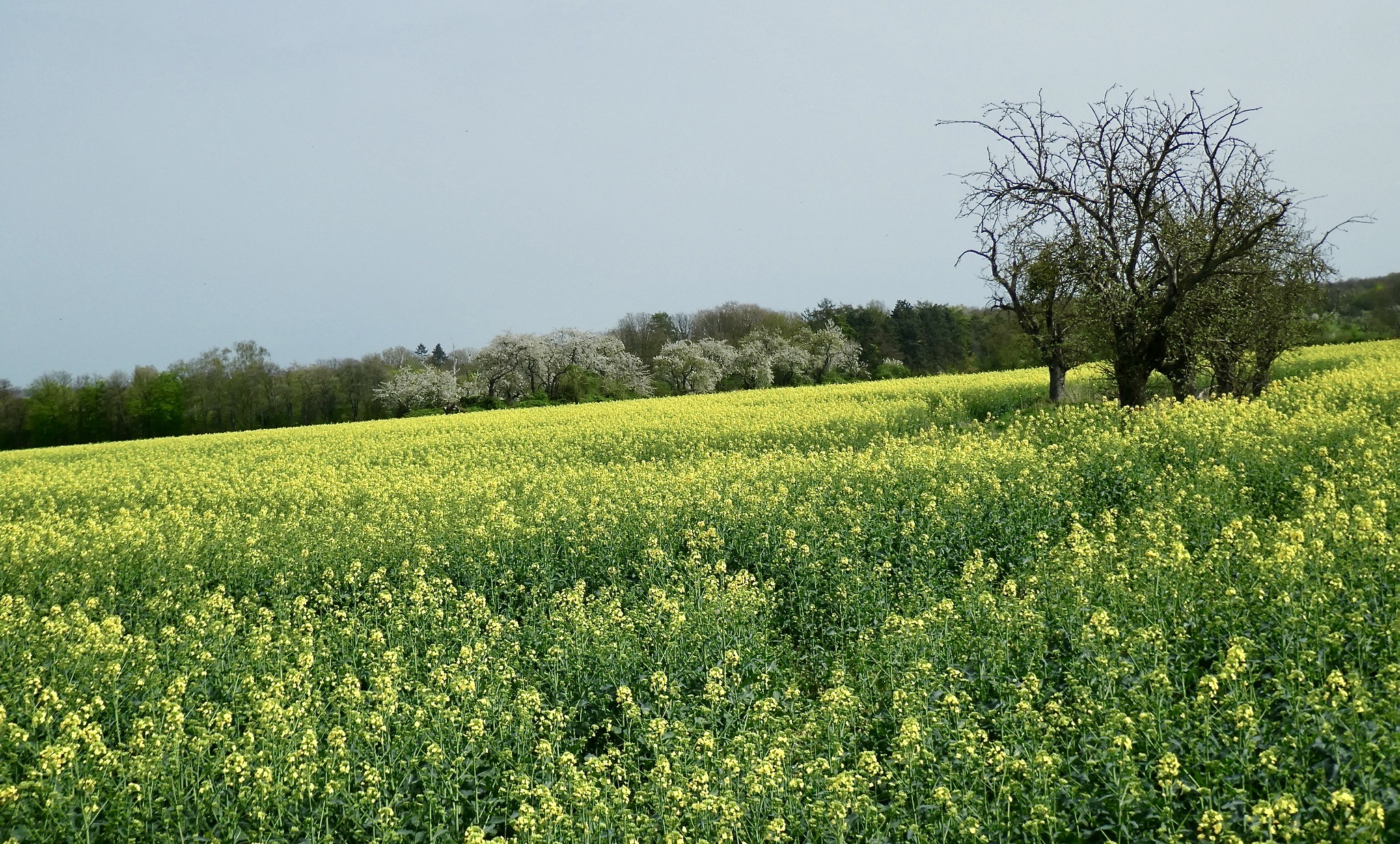 Auf der weiteren Wanderung vorbei an gelben Rapsfeldern und blühenden Obstbäumen fanden wir ein verlorenes Hundehalsband, ein bewohntes Wildbienennest, die Besitzerin von Hund und Hundehalsband bis wir schließlich den Bad Vilbeler Stadtteil Heilsberg erreichten, den wir im Wäschestangenslalom eilig durchquerten.