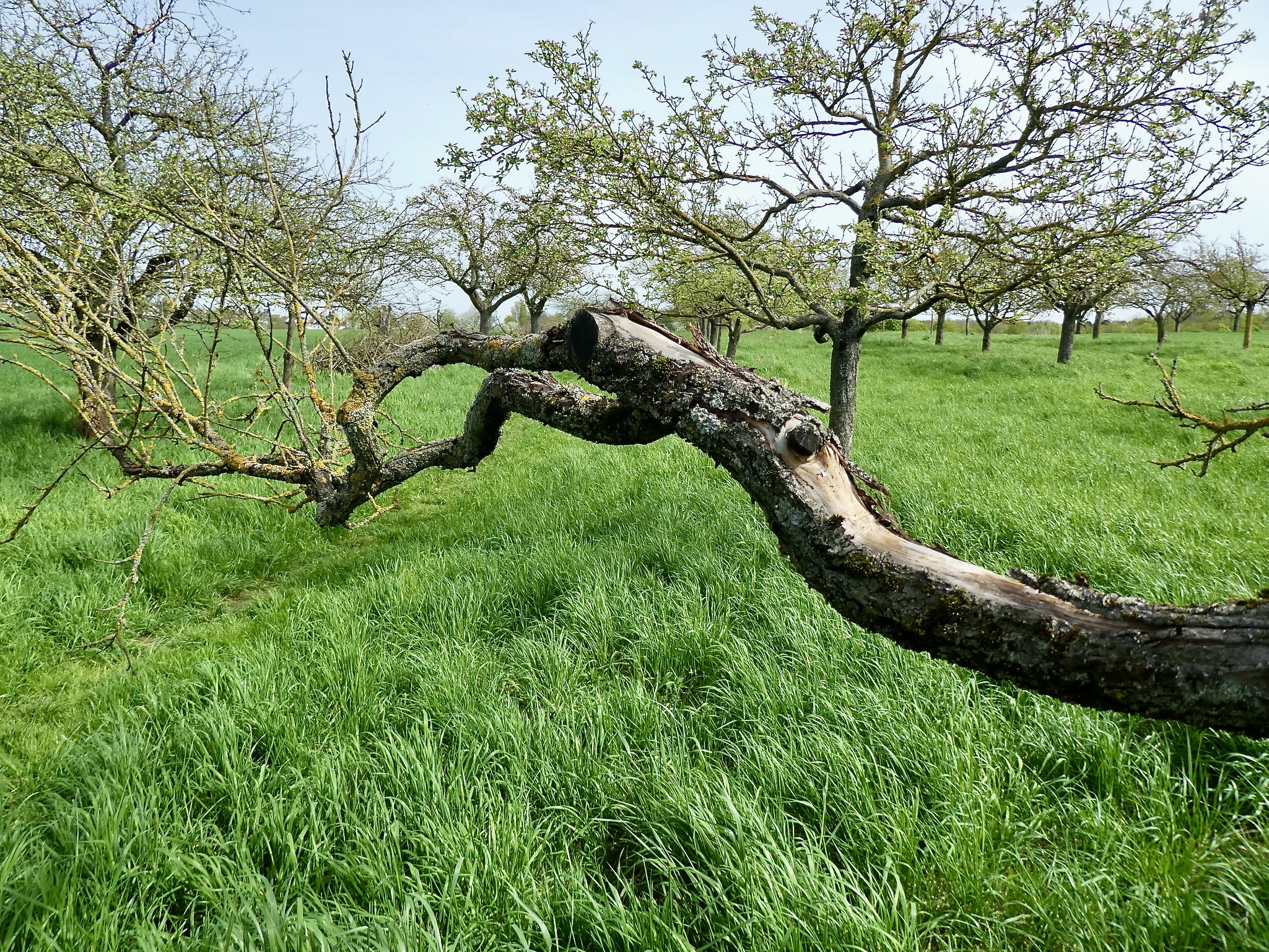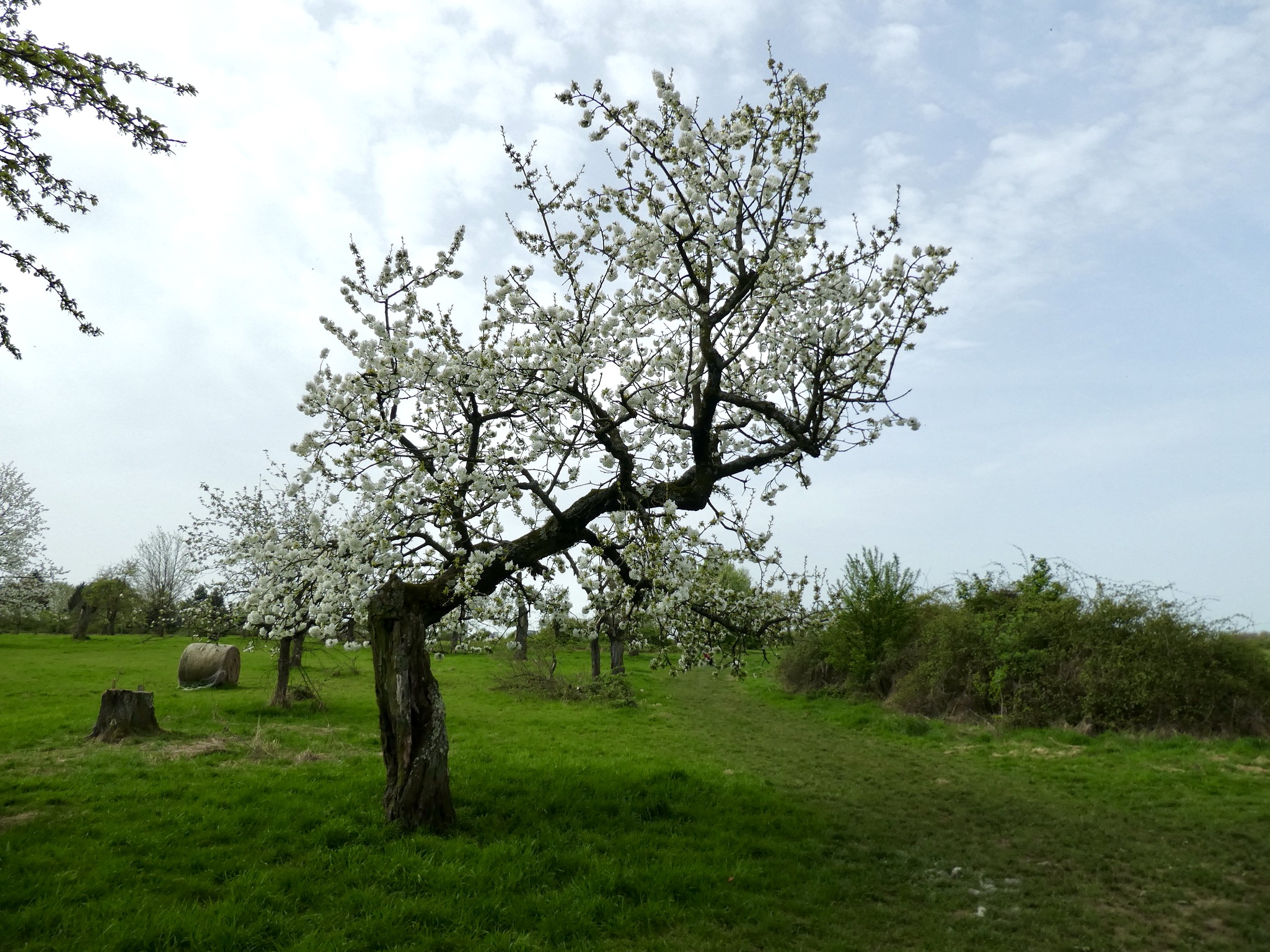 Über den Lohrberg vorbei am Gasthaus „Altes Zollhaus“ ging es auf dem Berger Rücken hinein in die bunten Streuobstwiesen, die von alten Apfel-, Kirsch- und Birnbäumen umsäumt sind. Die blühenden Obstbäume erinnerten uns an die Wanderung vor einigen Monaten, da hat zwar nichts geblüht, aber wir konnten Kirschen direkt vom Baum essen.