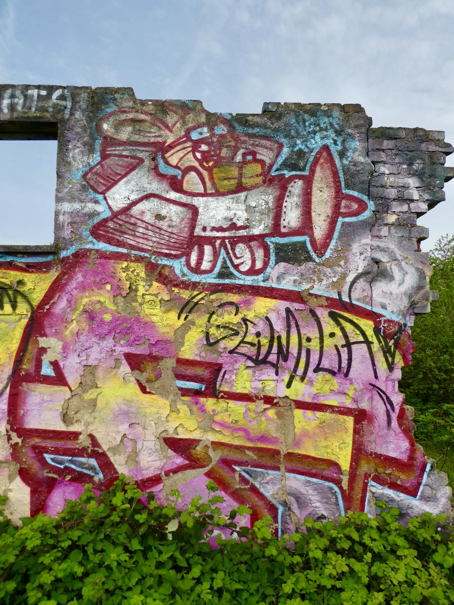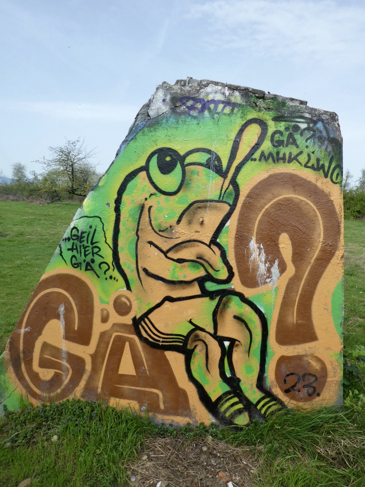 Weiter ging es zu den Überresten des Radiosenders Heiligenstock. „Die Sendeanlage nahe der Friedberger Landstraße ging am 10. Juli 1926 … in Betrieb … Kurz vor dem Anrücken der US-Armee wurde die Anlage am 25. März 1945 auf Befehl der Nationalsozialisten gesprengt. Die Behelfsantenne überstand den Zweiten Weltkrieg und wurde bis zur Errichtung eines neuen Sendemasten im Jahr 1947 benutzt. Dieser Sendemast war 122,5 Meter hoch. … Am 18. September 1967 wurde die Anlage durch den neuen Sender Weiskirchen ersetzt und die Einrichtungen später weitgehend demontiert. Teile des Geländes wurden aufgegeben. … Im Bereich der ehemaligen Sendemasten sind noch einige Betonfundamente und Gebäudereste frei zugänglich.“ (Quelle: Wikipedia)