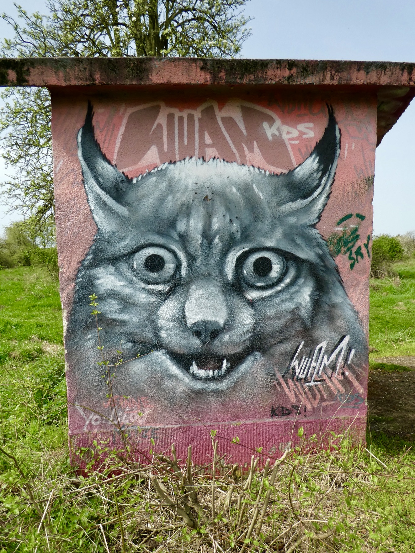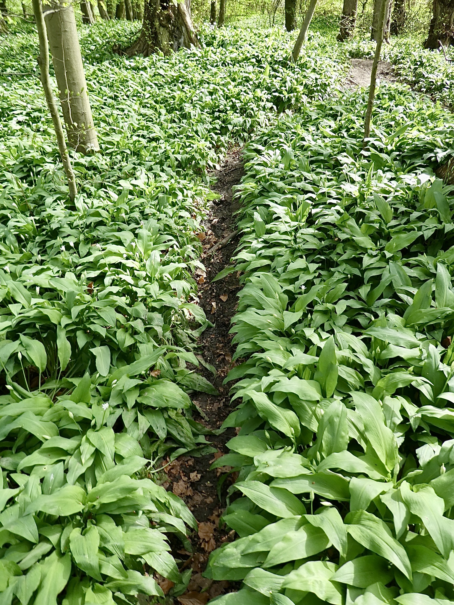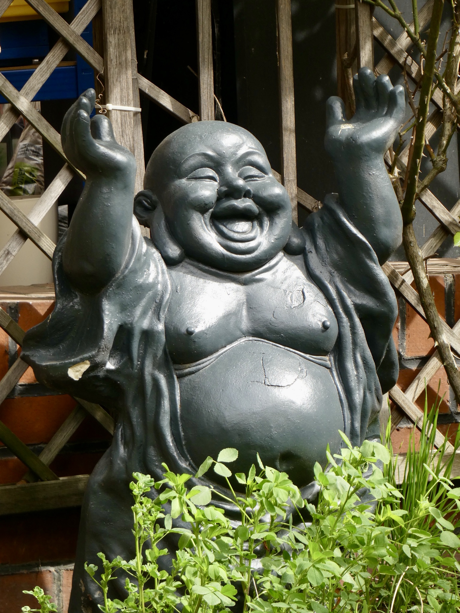 Durch den Bad Vilbeler Wald, umgeben von Bärlauch, ging es zurück nach Bergen-Enkheim. In der Röhrborngasse wurden wir von einem gut gelaunten Buddha und aufmerksamen Kater begrüßt.